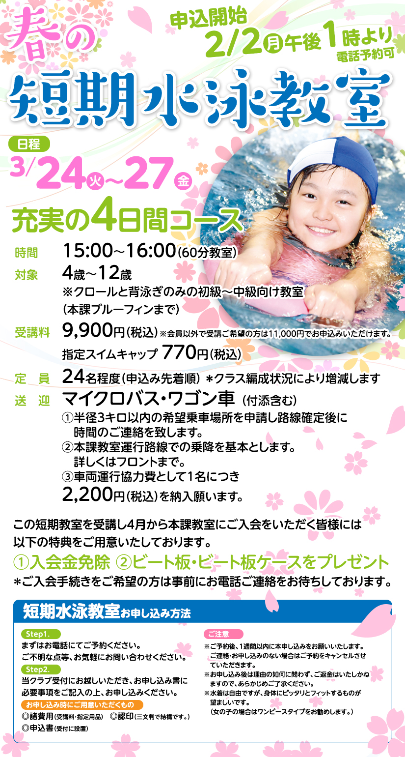 春休の短期水泳教室 ワクワクいっぱいの4日間コース:3/24〜3/27 受付中